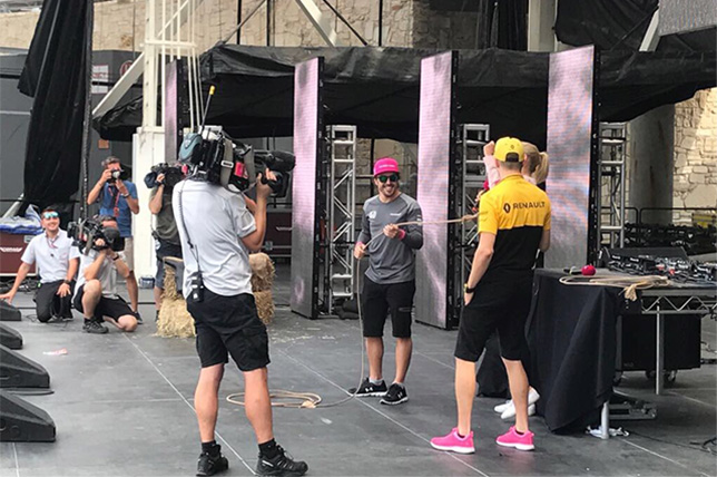 На сцене была установлена мишень в виде смешного бычка с пластиковыми рожками, и пилоты по очереди пытались его заарканить. За всем происходившим наблюдала впечатляющая толпа зрителей, которые всячески поддерживали участников. Впрочем, у них мало что получалось – набросить петлю на бычка не удалось никому. Но это не значит, что все попытки завершились ничем: Фернандо Алонсо довольно ловко накинул лассо на… Нико Хюлкенберга!
