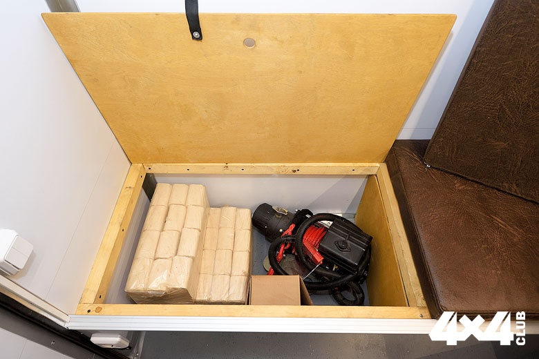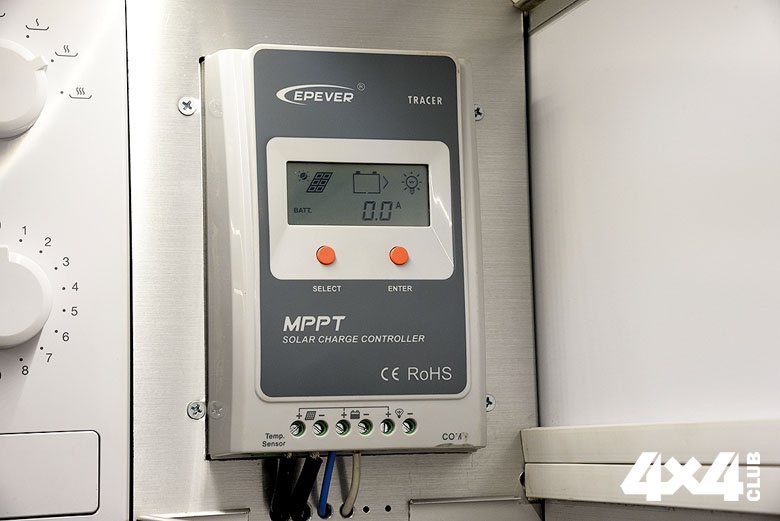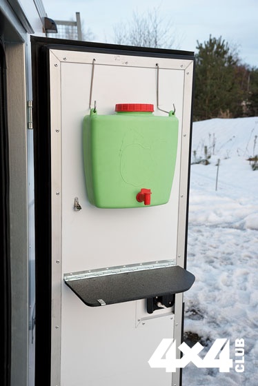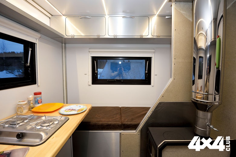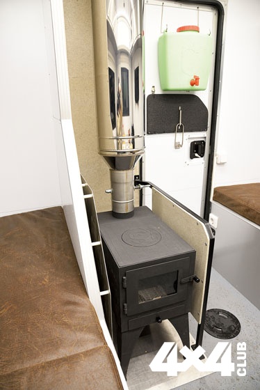 Справа от входа находится особая гордость изготовителя — печка, которая топится специальными брикетами (их запас хранится в левом рундуке). Печь помимо обогревания является альтернативным вариантом для приготовления пищи, если вдруг закончится газ. И наоборот, если по какой-либо причине нельзя будет пользоваться печью, предусмотрено газовое отопление. Раз уж речь зашла об отоплении, надо сказать, что в домике существует и система вентиляции, без которой отопление не слишком эффективно. Да и находиться внутри некомфортно. В походном положении все лючки, в том числе трубы печки и вентиляции, задраиваются во избежание попадания внутрь осадков.