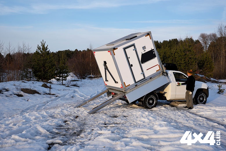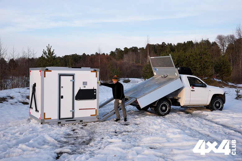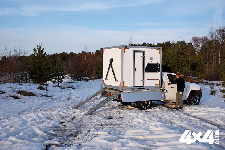 Домик станции оснащён лыжами, на которых он легко может скользить. Лыжи покрыты специальным морозоустойчивым пластиком, препятствующим примерзанию к снегу и льду. Спереди он оснащён кронштейнами для буксировочного устройства, в транспортном положении закреплённого на задней стенке. Это позволяет перемещать его с одного места рыбалки на другое без загрузки на шасси. Кстати, для загрузки домика-станции платформу оснастили электрической лебёдкой ComeUp тягой 6 000 фунтов — этого хватает с запасом. Наружные панели замаркировали светоотражающей лентой, потому что сам домик белый, и на белом снегу и льду, да ещё в сумерках, его не видно. В популярных местах лова коллеги-рыбаки на «Буханках» и резвящаяся на снегоходах молодёжь должны вовремя его заметить и успеть отвернуть. В передней стенке модуля есть внешняя розетка, через которую можно запитаться электричеством находясь на улице. На самом деле на крыше стоят солнечные панели, тоже способные с избытком снабжать электричеством, но только в светлое время суток.
