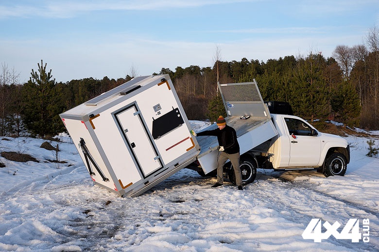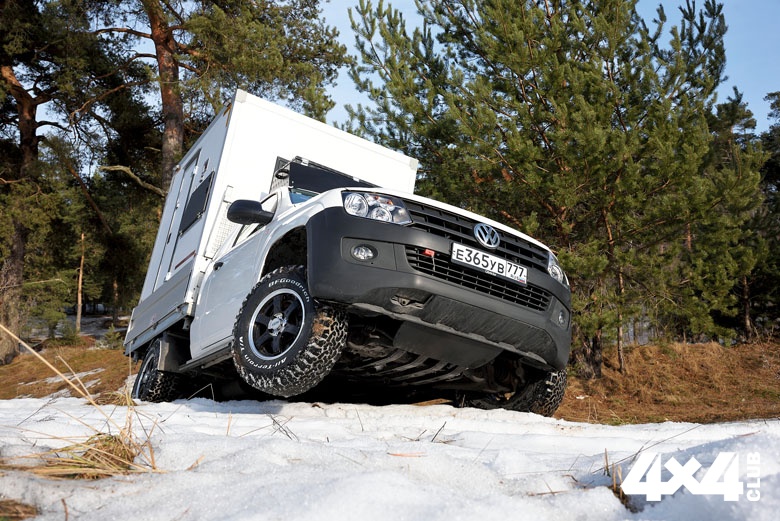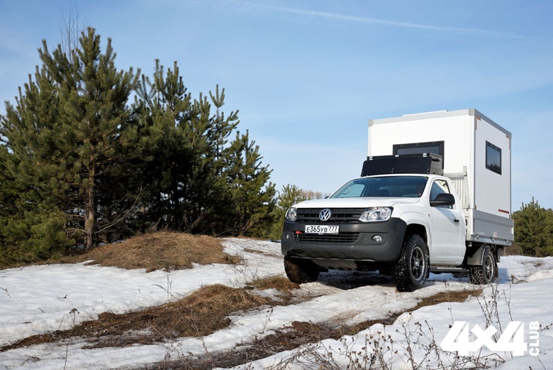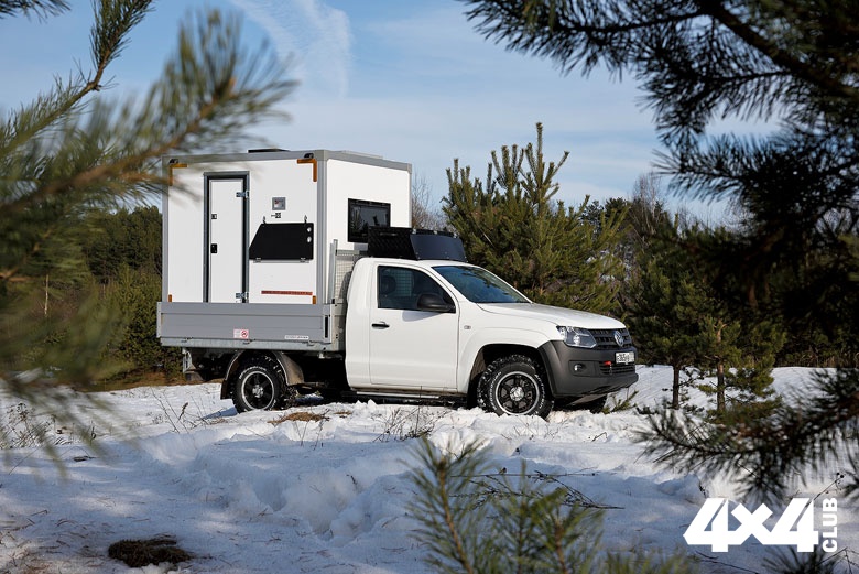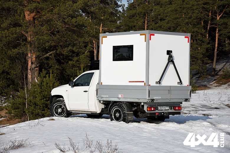 К стандартной внешности VW Amarok добавили силовые пороги, на которые удобно вставать, чтобы дотянуться до багажного ящика, размещённого на крыше кабины. Ящик прикрыт аэродинамическим щитком, который одновременно выполняет функцию защиты стекла домика от веток при движении по лесу. Подготовили машину к тяжёлым дорогам и снизу, установив защиту из труб, протянувшуюся до самой последней поперечины рамы. Она призвана сохранять агрегаты от ударов о торосы и при этом не собирает снег. Для самовытаскивания у внедорожника есть съёмная переносная лебёдка, для подключения которой спереди и сзади вывели разъёмы, а для подогрева двигателя в мороз на него установили проверенную предпусковую автономку Webasto.
