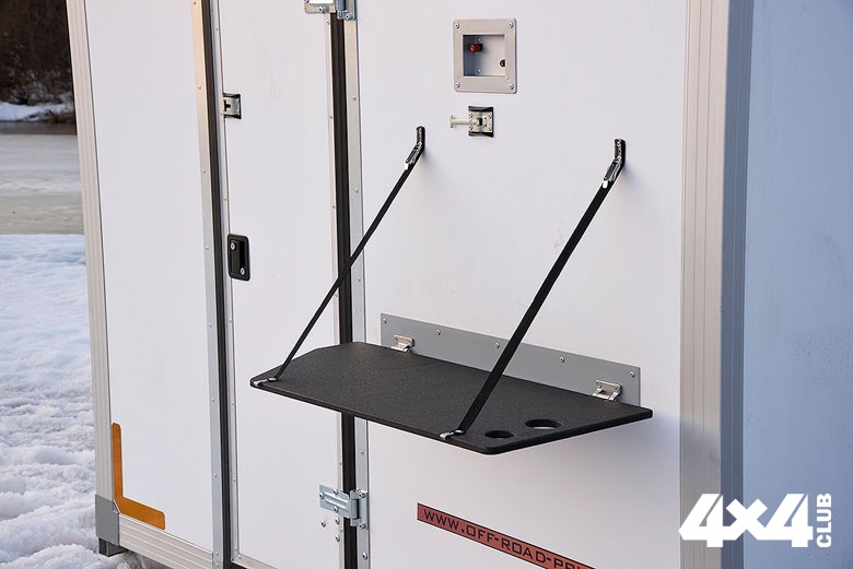 Стенки изготовлены из сэндвич-панелей толщиной 50 мм (пол — 80 мм, крыша — 60 мм), а окна — из термостойких стеклопакетов, поэтому внутри всегда хорошо сохраняется тепло. Кстати, внутри это автономное убежище подлёдного рыбака — чудо идеальной организации пространства. Например, на дверце с внутренней стороны — подвесной рукомойник, а под ним — откидной столик, на который можно установить лоток для слива использованной воды. В полу целых три лючка! Два — исключительно для спуска снастей, а ещё один — для использования эхолота или камеры для подлёдной съёмки. Тут же, рядом со входом, размещены розетки на 220 и 12 V и выключатели освещения. В целом планировка интерьера — это купе с расположенными друг напротив друга банкетками. Под левой банкеткой, обитой приятной на ощупь тканью, похожей на экокожу, скрыты рундуки. В одном из них хранятся всевозможные аксессуары и переносная электрическая лебёдка, а в соседнем лежит надставка трубы отопления и газовые баллоны. Посередине — плита и столик, под которым прячется шкафчик со всей необходимой посудой. Над шкафчиком, под крышей, открытая полка для необходимых припасов. Справа под крышей — закрывающиеся ящички. А под правой банкеткой находятся аккумулятор и инвертор на 220 V.