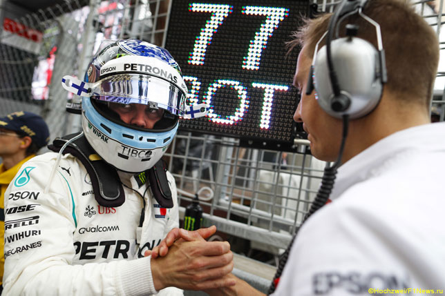 Валттери Боттас: «С первого круга казалось, что Ferrari немного быстрее и контролирует гонку. Я атаковал, но под конец у меня начались некоторые проблемы – пришлось экономить топливо. Это позволило Максу приблизиться.
