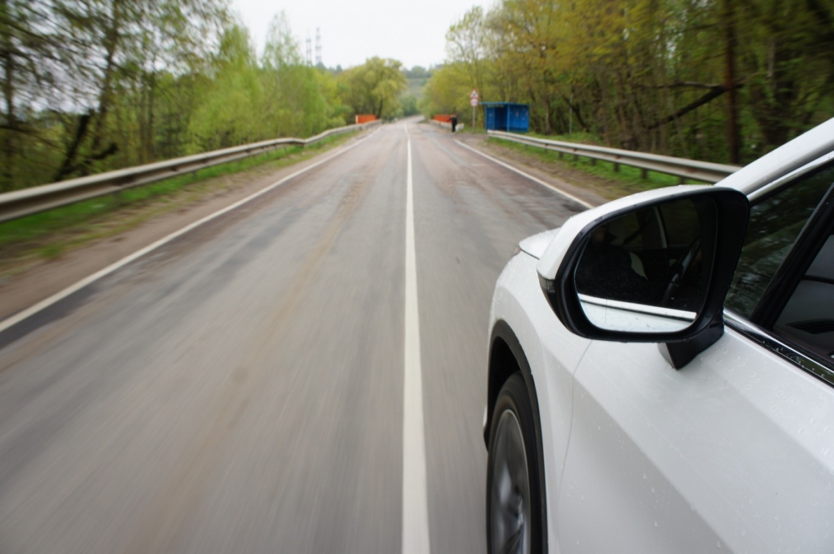 В дождливую погоду устойчивость машины естественно ухудшается, особенно на высоких скоростях. Тормозной путь увеличивается пропорционально квадрату скорости. Но у Bridgestone Dueler H/P Sport риск аквапланирования значительно снижен за счет наклонных канавок, предназначенных для отвода воды в направлении основных канавок, и вогнутых блоков, снижающих турбулентность и обеспечивающих благодаря этому более эффективный отвод воды. Четыре прямые канавки надежно отводят воду и обеспечивают высокий уровень сцепления с дорогой. Однако чудес не бывает: законы физики никто не отменял, поэтому когда в ливень я намеренно вошел в поворот на скорости около 100 км/ч, то… «поплыл». Однако, несмотря на мелькнувшее на долю секунды чувство страха, cумел быстро сбросить скорость и мгновенно выровнять автомобиль.