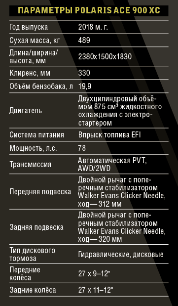 На стальной пространственный каркас американцы нарастили много прокачанного инженерного «мяса». В машину длиной всего 2,38 м и шириной 1,5 м был имплантирован двухцилиндровый жидкостного охлаждения четырёхтактный двигатель Pro Star мощностью 78 л.с. И это на 489 кг сухой массы! То есть энерговооруженность нового Ace почти вышла на уровень старшего брата — RZR 1000, мощность которого составляет 110 л.с. при сухом весе в 679 кг. Двигатель работает в тандеме с фирменной системой On-Demand True All-Wheel Drive. Нажав соответствующую кнопку на приборной панели, можно выбрать режим 2WD или активировать полный привод, который подключается автоматически при пробуксовке колёс. Передняя подвеска собрана на двойных рычагах с поперечным стабилизатором и амортизаторами Walker Evans Clicker Needle с ходом 31,2 см. Сзади тоже установлены двойные рычаги и аналогичные амортизаторы с ходом 32 см. Колёсная база малыша составляет 171,5 см против 228,6 см у RZR. Габаритные размеры, колея и база Ace 900 существенно выросли по сравнению с Ace 570, хотя с учётом новой мощной силовой установки это неудивительно. Даже клиренс увеличился до существенных 33 см, и при необходимости на Ace 900 XC вполне можно штурмовать реальное бездорожье (тем более что в стоке он оснащается колёсами GBC Dirt Commander с размерностью 27 x 9–12 и 27 x 11–12 соответственно). Внешне мотовездеход сохраняет все фамильные черты семейств Ace и RZR. Рубленый, угловатый силуэт и агрессивные ломаные линии недвусмысленно намекают на экстремальную сущность новинки. В кокпите установлены регулируемое кресло с боковой поддержкой, регулируемый по высоте руль и уже знакомая по другим моделям Polaris приборная панель. Несмотря на небольшие размеры мотовездехода сидеть в нём удобно даже крупным людям. Традиционно в передней части под специальной крышкой находится багажная ёмкость (55 кг), а сзади — небольшой кузов грузоподъёмностью 110 кг.