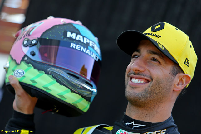 После перехода в Renault Даниэль Риккардо впервые в карьере был абсолютно свободен в разработке дизайна шлема. На предсезонных тестах австралийский гонщик использовал промежуточную версию дизайна, а в четверг в Мельбурне представил новую расцветку.