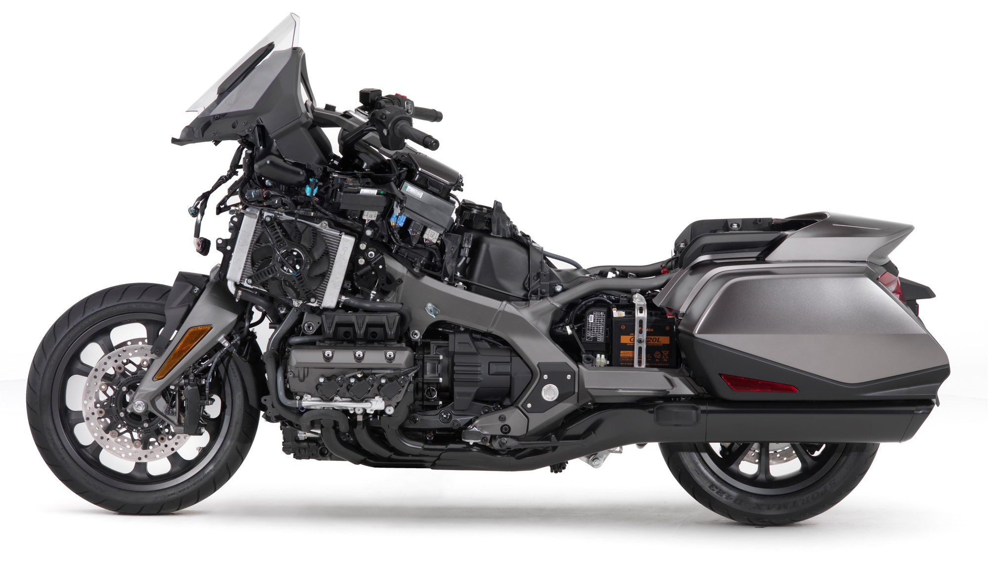 Архитектура мотора осталась прежней — это всё так же уникальный для мира мототехники 6-цилиндровый оппозит — но конструктивно двигатель новинки существенно отличается от силовой установки предыдущего поколения. 1833-кубовый мотор получил 4-клапанные головки с камерами сгорания в форме «двускатная крыша» (вместо прежних 2-клапанных «голов» и полусферических камер), оптимизированный ГРМ с одним распредвалом на каждый блок цилиндров — система Honda Unicam (привод клапанов совмещает рокера скользящего типа для впускных клапанов, и роликового типа для выпускных), усиленный коленвал, цилиндры уменьшенного на 1 мм диаметра (теперь у оппозитной «шестёрки» так называемая квадратная размерность: соотношение хода поршня к диаметру цилиндров составляет симметричное 73 х 73 мм), одну дроссельную заслонку (вместо прежних двух) с полностью переделанными впускной и выпускной системами… Макс. мощность составляет 93 кВт (126 л.с.), которые «снимаются» на 5,500 об/мин. Максимальный крутящий момент — 170 Нм при 4,500 об/мин. Мотор стал компактнее и легче на 6,2 кг.