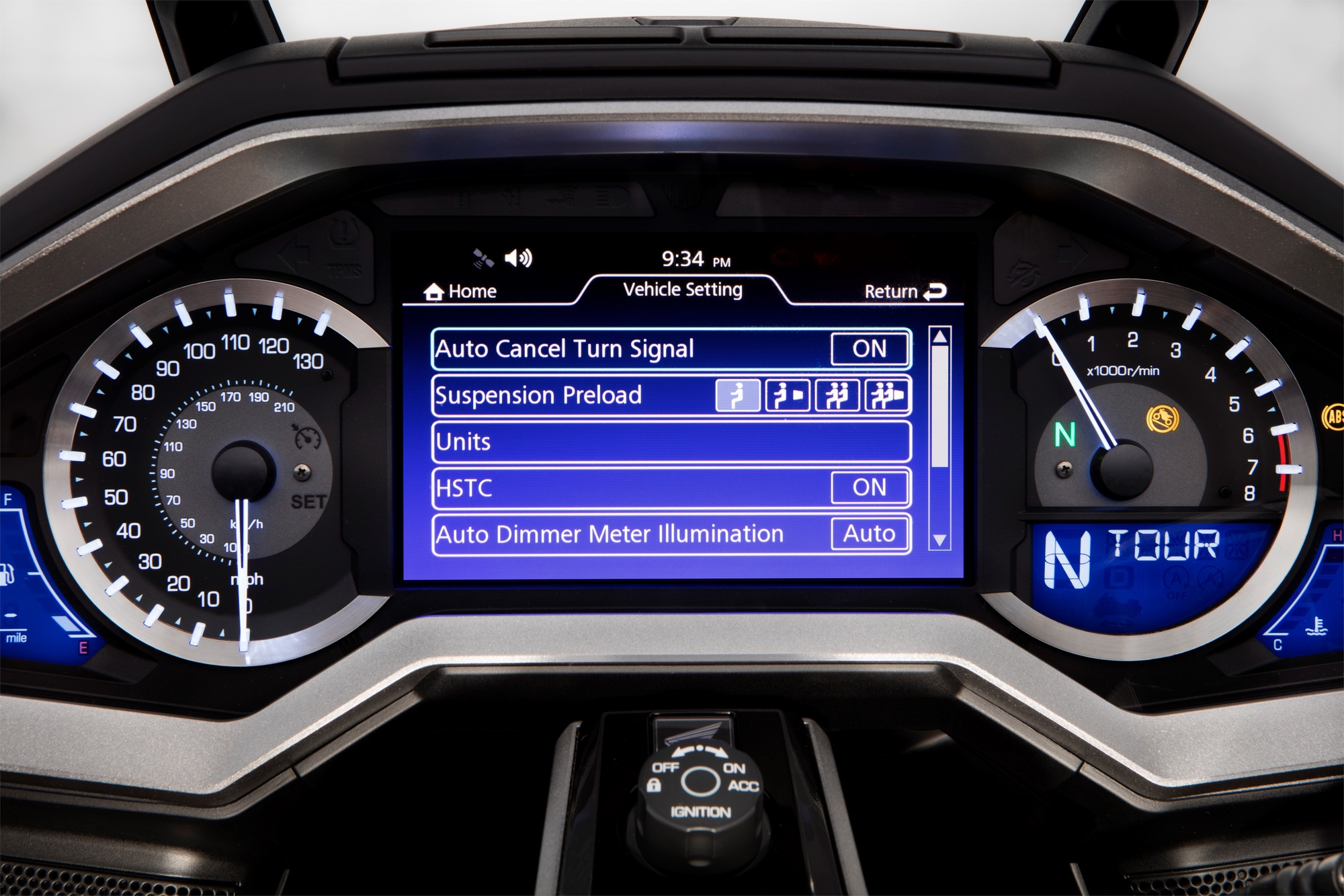 Приборная панель со стрелочными спидометром и тахометром, плюс 7-дюймовым цветным TFT-экраном — для удобной настройки и отображения параметров мотоциклов. Сюда же выводится информация с мультимедиа-системы и GPS-навигации. Яркость регулируется автоматически (максимальный уровень интенсивности экрана – 1000 кд), пилот также может выбрать один из 8 уровней яркости.