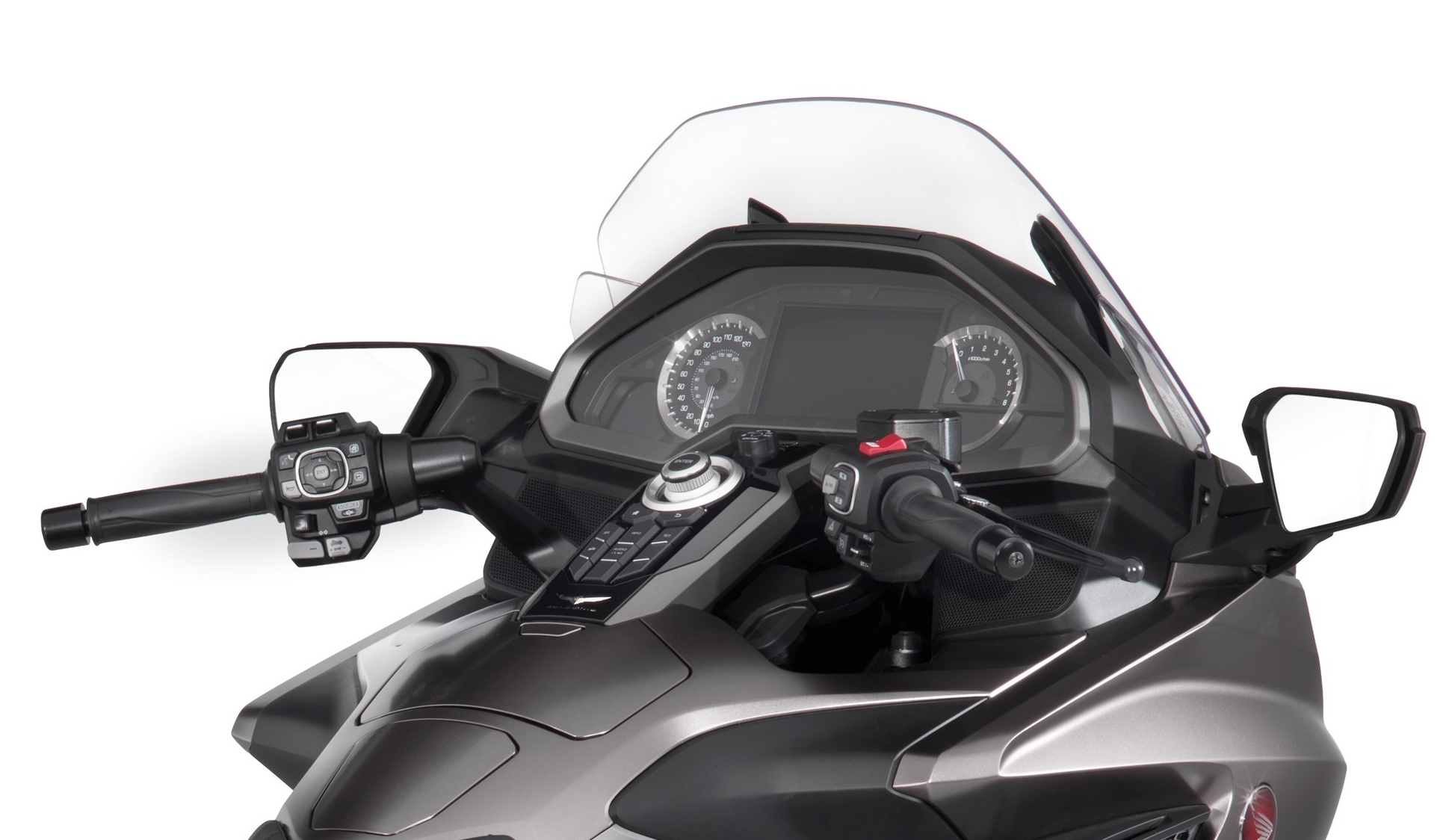 В качестве опции новинка Honda может быть укомплектована полностью новой автоматической трансмиссией с двумя сцеплениями — Honda DCT — которая в версии Gold Wing 2018 модельного года имеет… 7 передач! Как и в прежних вариациях DCT, каждое сцепление независимо контролируется своим электро-гидравлическим контуром. Когда происходит смена передач, система заранее выбирает следующую ступень трансмиссии, используя то сцепление, которое в данный момент не задействовано. Затем электроника отключает первое сцепление – и одновременно включает второе. Плюс новый Gold Wing с DCT получил функцию Walking Mode («режим ходьбы»), которая позволяет двигаться вперёд со скоростью 1,8 км/ч, либо назад со скоростью 1,2 км/ч — управление осуществляется клавишами + и — на левом пульте.
