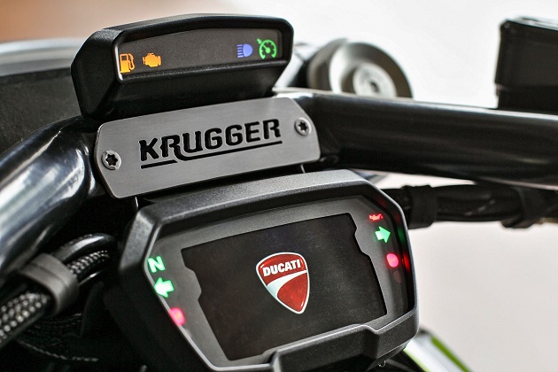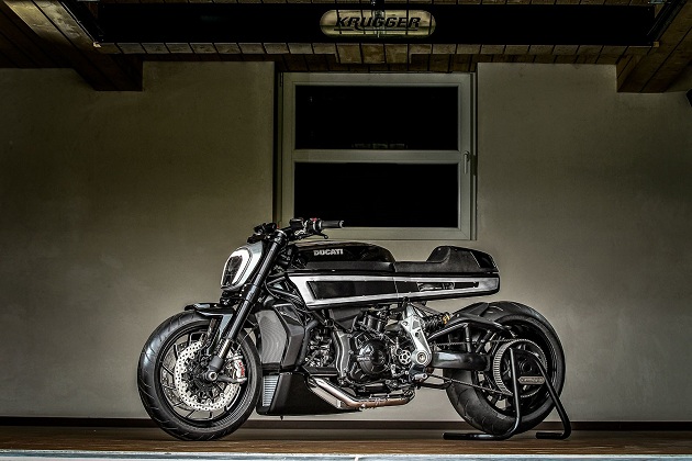 Неожиданно выступил мастер афтермаркетных дел с интересным именем Фред Крюггер (уж не тот ли самый?), подошедший к вопросах тюнинга XDiavel довольно радикально. Главные особенности байка, названного Thiverval в честь маленького трека неподалеку от Парижа, — другой топливный бак, прямой хвост и накладки, скрывающие раму типа «птичья клетка». Странно, что этот яркий элемент дизайна байка решили замаскировать. Зато получилось грубо, зримо и довольно необычно.
