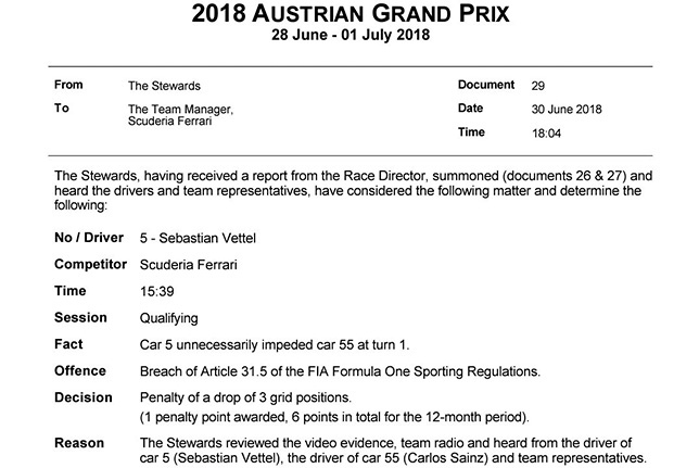 Стюарды Гран При Австрии приняли решение наказать Себастьяна Феттеля за блокировку Карлоса Сайнса во второй части квалификации. Чтобы избежать столкновения с медленной машиной Себастьяна, только что закончившего свой быстрый круг, Карлосу пришлось выехать за пределы трассы.