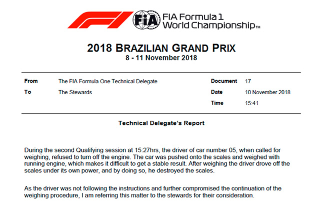 Обычно для выполнения этой процедуры требуется выключить двигатель, а затем машину вручную откатывают в расположение боксов команды. Однако Феттель очень торопился, так как в любую секунду мог начаться дождь, потому отказался выполнять инструкции и не заглушил машину. Технический делегат FIA Джо Бауэр заявил, что в результате весы сломались, и он передал инцидент на рассмотрение стюардов.