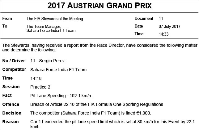 Серхио Перес проехал со скоростью 102,1 км/ч вместо разрешенных сегодня 80 км/ч – в Force India заплатят €1000.
