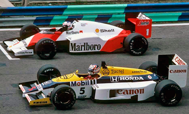 Главной интригой теперь была борьба между Мэнселлом и Простом. Ален ехал очень быстро и расстояние между лидерами стремительно сокращалось – если на 16-м круге пилот McLaren уступал семь секунд, то на 22-м уже менее трёх. Однако до прямого сражения не дошло: вскоре выяснилось, что в Williams решили использовать иную стратегию и останавливаться дважды. Не успел Ален догнать Найджела, как тот свернул на пит-лейн.