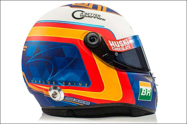 На шлеме Карлоса Сайнса осталась привычная красно-оранжевая полоса, но номер на верхней части теперь окружает большой белый круг, а задняя часть стала синей с логотипом McLaren.
