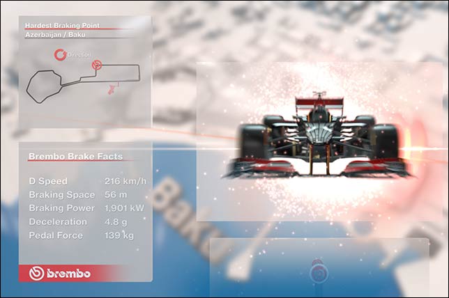 Перед третьим поворотом трассы в Баку на отрезке в 56 метров нужно сбросить скорость на 216 км/ч. При этом усилие на педали тормоза составит 139 кг, пилоты испытают перегрузки в 4,8 g, а на торможении высвободится энергия, эквивалентная 1901 кВт.