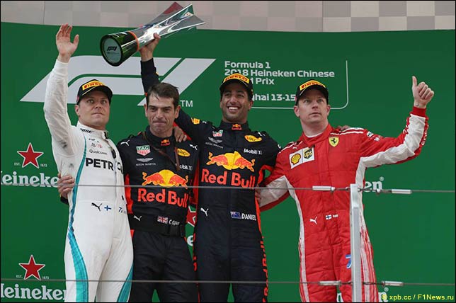 Даниэль Риккардо выиграл Гран При Китая, одержав шестую победу в карьере. Валттери Боттас поднялся на вторую ступеньку подиума, Кими Райкконен финишировал третьим.