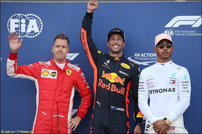 Даниэль Риккардо выиграл квалификацию, завоевав второй поул в карьере – в прошлый раз он стартовал первым в 2016-м – и тоже в Монако. Вместе с ним с первого ряда гонку начнёт Себастьян Феттель, со второго стартуют Хэмилтон и Райкконен, с третьего – Боттас и Окон.