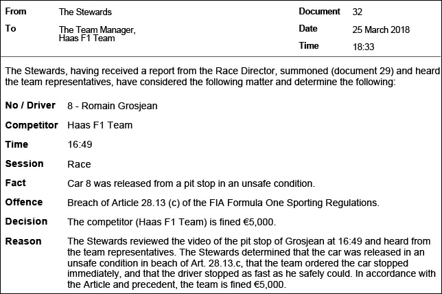 Рассмотрев инциденты с плохо закреплёнными колёсами во время пит-стопов Кевина Магнуссена и Романа Грожана, стюарды Гран При Австралии признали вину команды в небезопасном выпуске машины на трассу.
