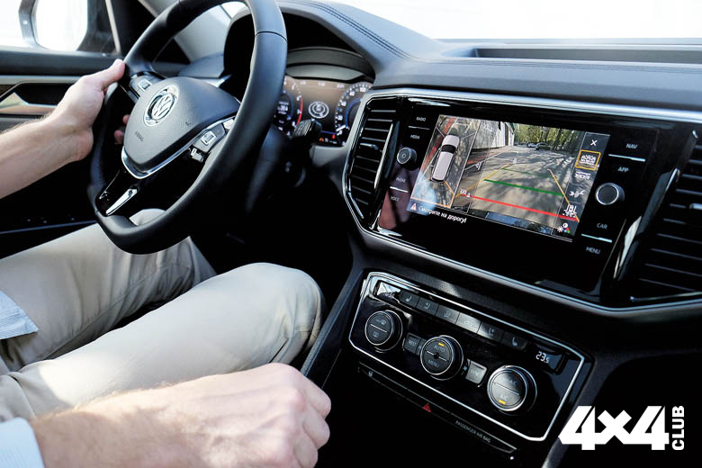 Думаю, многодетные родители часто сталкиваются с тем, что после усилий, затраченных на утренние сборы, кормёжку и уборку последствий утренних сборов, осуществлять грандиозные планы на семейный отдых уже не хочется. Но у нас был новый Teramont, который буквально манил в дорогу, своими впечатляющими габаритами обещая комфортное путешествие. Так вот, первое, что бросается в глаза, когда оказываешься за рулём VW Teramont — большая цифровая приборная панель и дисплей центральной консоли. Сразу вспоминаются фантастические фильмы известной франшизы Джорджа Лукаса о далёком будущем, и кажется, что на мониторе вот-вот появятся уплывающие в прямой линейной перспективе строки и заиграет музыкальная тема «Звёздных войн». И даже дети, рассматривая стеклянную крышу и большой люк над головой, сразу же назвали автомобиль настоящим «имперским крейсером». При этом странно, что разработчики такой большой машины разместили на передней панели только один слот USB, а второй спрятали в бокс центрального подлокотника. Возможно, для одного водителя имеющегося гнезда и достаточно, но если пассажирское сиденье тоже занято и надо подключить два телефона, возникает некоторый дискомфорт. Ещё одна странность — манипуляции с обычной ручкой громкости медиасистемы, расположенной в привычном месте центральной консоли — в левом верхнем углу стеклянного экрана. Сама ручка не вызывает вопросов, да и находится на своём месте. Но вот стеклянная панель под ней, словно тачскрин, воспринимает касание пальцев, крутящих громкость, как команду сменить диапазон или вообще переключить приёмник на вход Bluetooth. В результате за первые же пять минут мы приучились вообще не снимать руки с руля и регулировать громкость оттуда — кнопками. А как быть тем, кто всё-таки желает покрутить ручку?