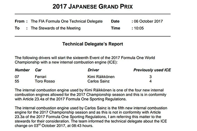 Перед началом первой тренировки в Сузуке на семи машинах были заменены элементы силовых установок. На Toro Rosso Карлоса Сайнса установлены новые двигатель внутреннего сгорания, турбина и MGU-H. Все три элемента для испанца пятые за сезон, а значит его ждёт потеря 20 мест на стартовой решётке.