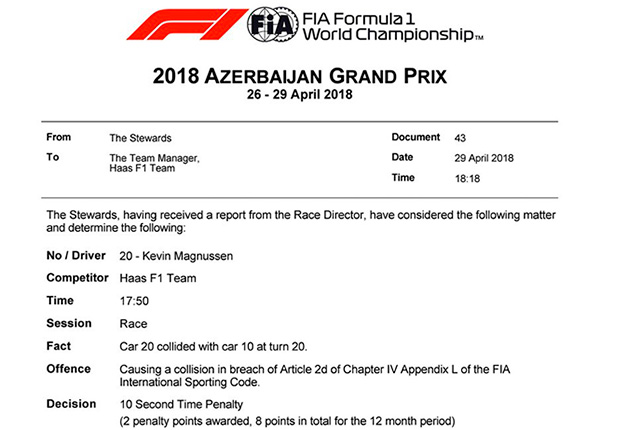 Пилот Haas F1 Кевин Магнуссен после гонки в Баку стал лидером по штрафным баллам. Стюарды наказали Кевина за столкновение с Пьером Гасли в конце гонки, он получил 10-секундный штраф, который был добавлен к его времени, а также два штрафных балла.