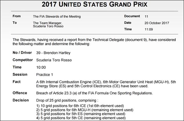 Брендон Хартли наказан штрафом с потерей 25 позиций, Нико Хюлкенберг – двадцати, Стоффель Вандорн – пяти.