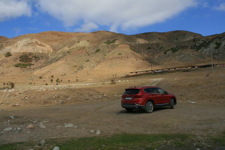 Выбор полноприводного автомобиля для этой поездки был для нас совершенно очевиден, поскольку не приходилось ожидать разветвлённой дорожной сети, к тому же мы хотели посетить ряд интересных мест, к которым дорог вообще могло и не быть. Таким автомобилем стал для нас новый корейский кроссовер Santa Fe. Довольно-таки большой и вместительный, он не обещал выдающихся внедорожных качеств, но зато обладал множеством полезных «примочек» для комфортного путешествия.