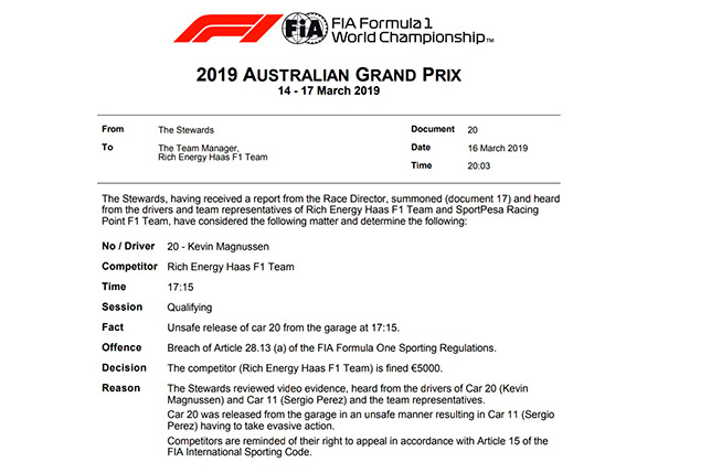 Команда Haas F1 оштрафована на 5000 евро за небезопасный выпуск на трассу машины Кевина Магнуссена во время квалификации — датчанин едва не столкнулся c Серхио Пересом.
