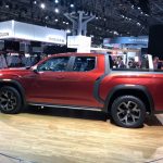 В статусе прототипа Atlas Tanoak выглядит футуристично. Образующие элементы дизайна спереди и сзади подчеркнуты сложной LED-светографикой, 20-дюймовые колеса обуты в зубастые шины, а ручки задних дверей сделаны по принципу «невидимок». За кабиной прячется сдвижная рама, которая может быть использована для крепления спортинвентаря.