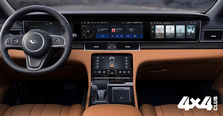 Интерьер производит сильное впечатление: щедрая отделка кожей и деревом, лаконичный дизайн, миниум физических клавиш, трехспицевый руль в стиле Audi и огромное «табло» вместо традиционного щитка приборов. Верхняя панель набрана из трех экранов с диагональю 12,3, 16,2 и 12,3 дюйма, а на центральной консоли имеется четвертый 10,1-дюймовый монитор. Подчеркивается, что все эти «телевизоры» стабильно работают в широком диапазоне температур: от минус 35 до плюс 85 градусов Цельсия. В салоне установлены три ряда сидений, средний может состоять из двух раздельных кресел либо из трехместного дивана.
