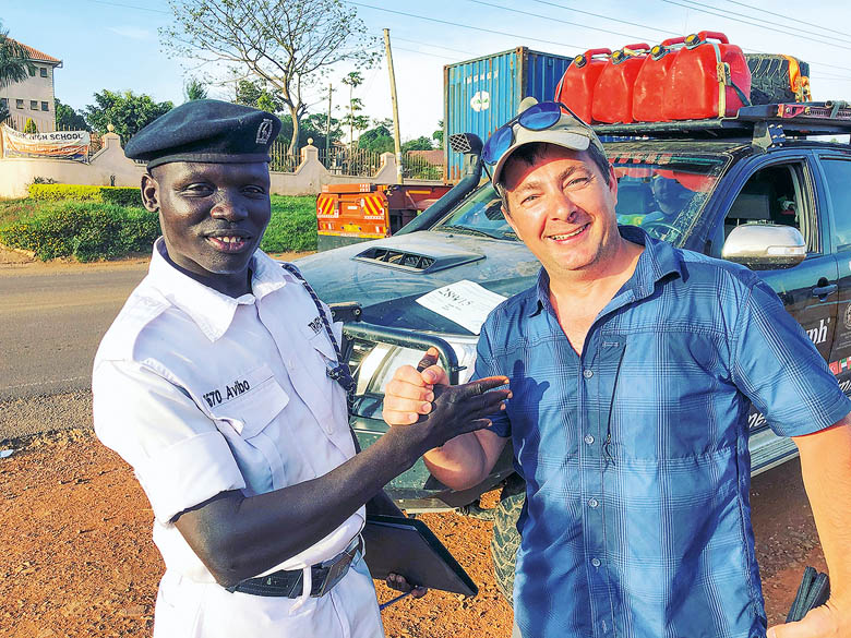 Через полминуты угандийский полицейский и Миша, улыбаясь, рассматривают совместные фотографии, выбирая самую удачную. Про штраф уже никто не вспоминает.