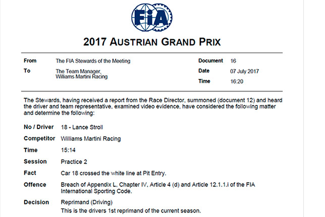 Стюарды Гран При Австрии наказали пилота Williams Лэнса Стролла за пересечение белой линии на въезде на пит-лейн во время второй сессии свободных заездов. Стролл получил официальное предупреждение. Это первое подобное наказание для канадца.