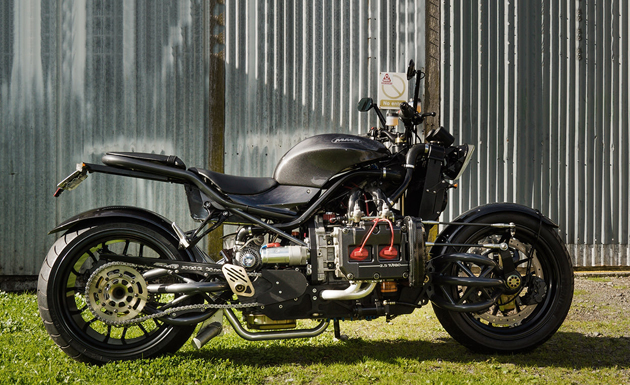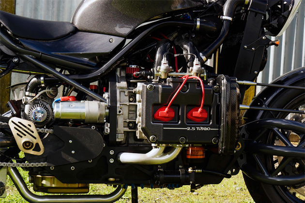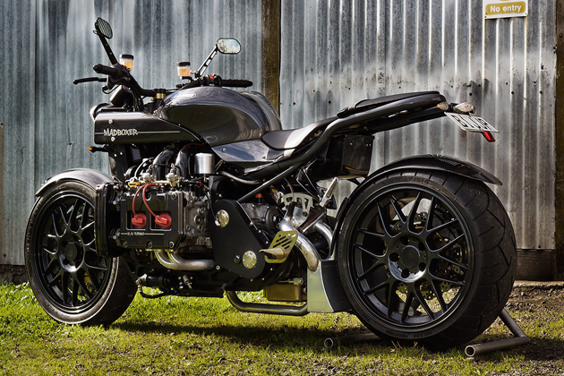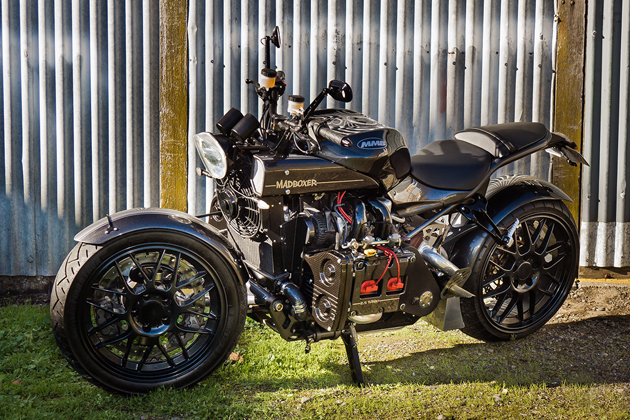 Этот самый оззи всего лишь показал Марселю скетч мотоцикла с оппозитным двигателем Subaru, и кастомайзер воспринял увиденное как сигнал к действию. То, что получилось в итоге, вы можете созерцать на фотографиях. Тяжеловес массой 313,5 кг с очень подходящим прозвищем Madboxer несёт в себе оппозитную 2,5-литровую «четверку» семейства EJ (в народе — «еж») от Subaru WRX. Есть, правда, отличия: стоковый турбонагнетатель заменён на схему twin-turbo от Legacy. Коробка передач двухступенчатая автоматическая, привод заднего колеса цепью. Тормозная система позаимствована у Buell. На Madboxer, наверное, никто не оборачивается, ибо характерный звук субаровского оппозита — вполне привычное явление. Но пролетающий мимо байк определенно вызывает шок! Узнать побольше о мотоциклах с автомобильными движками вы можете по ссылке.