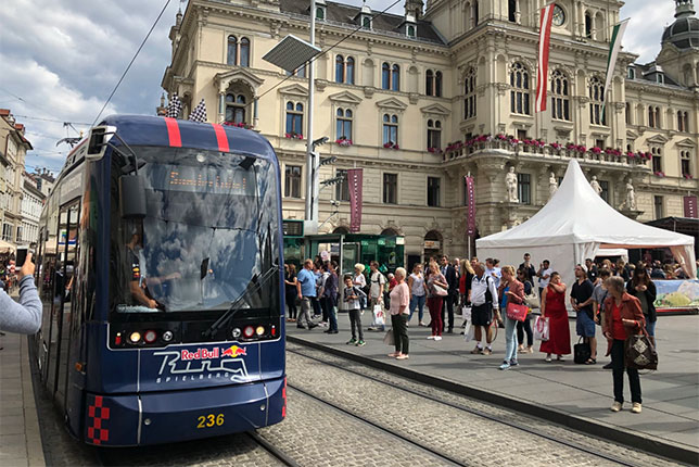 В конце апреля, за два месяца до Гран При Австрии мы рассказывали о том, что в городе Граце, столице федеральной земли Штирии, появился трамвай, выкрашенный в традиционную цветовую гамму Red Bull, а на его корпусе и стёклах была размещена реклама предстоящей гонки Формулы 1.