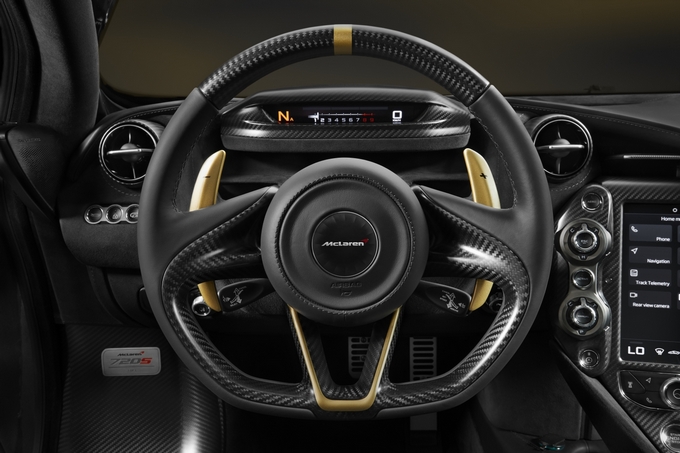 Само собой, добавили желтого цвета и в салон: вставки «под золото» появились на спицах и ободе рулевого колеса и дверных панелях. Облагородили и подрулевые лепестки, в общем, тот единственный покупатель, которому достанется модернизированный таким образом 720S, будет доволен.