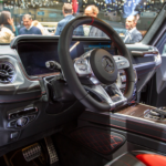 Если, конечно, не ограничить его возможности искусственно — например, заказав доступные в числе опций 22-дюймовые колёсные диски. Набор спортивных дизайнов колёс является непременным признаком самого быстрого варианта «Гелика», равно как и решётка радиатора с вертикальными прутьями, массивные угловатые бамперы с большими воздуховодами, а также выведенные под пороги патрубки глушителя. Внутри из отличий от версий поспокойнее — спортивные кресла и руль, а в остальном можно выбирать из богатейшего оснащения обычного G-класса.