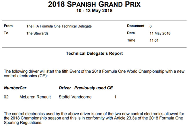 В Испании Стоффель Вандорн будет использовать новый блок управляющей электроники — перед пятничными тренировками в FIA подтвердили замену элемента силовой установки на машине McLaren.
