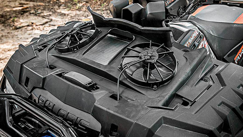 Итак, что же такое Sportsman XP 1000 High Lifter Edition? В его основе утилитарный Polaris Sportsman. Двигатель объёмом 952 см3 выдаёт 85 л. с., но куда важнее его постоянный крутящий момент в широком диапазоне оборотов. Двигатель хорошо защищён. Воздухозаборники мотора и охлаждения вариатора выведены вверх, сам вариатор с пониженным передаточным отношением перенастроен для более уверенного вращения огромных колёс. Радиатор с целью защиты от камней и веток поднят максимально высоко и расположен спереди горизонтально. Как и у стандартного Polaris Sportsman, система полного привода AWD самостоятельно регулирует подключение передних колёс в зависимости от дорожного покрытия.