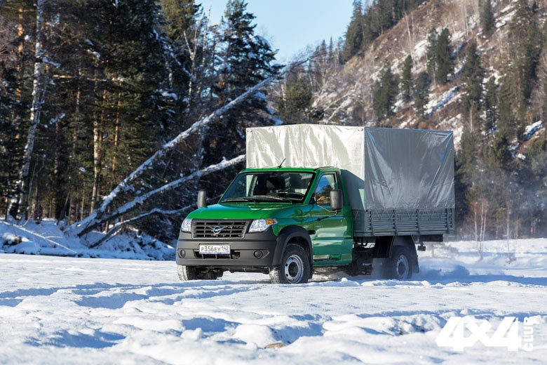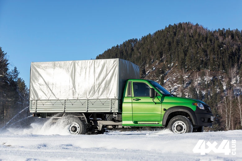 Мы, конечно, в первую очередь взялись испытывать полноприводный вариант «Профи». Тяжёлого бездорожья ему в этот раз не досталось (мы приберегли его для самостоятельного теста на привычных нам полигонах), зато с лихвой хватило разбитых и обледенелых кемеровских дорог. Тот самый уголь мы везли к сельским фермам, и подъезды к ним традиционно не балуют гладкостью покрытия. В основном оно состоит из полузамёрзшей глины. Надо сказать, что разница между полноприводной и моноприводной версией грузовика сказывается не только на тяжёлом грунте. Несмотря на приличный груз в кузове, версия «Профи» 4х4 гораздо лучше преодолевает скользкие подъёмы и колеи. Ещё лучше она справляется с глубоким снегом, в котором монопривод с полутора тоннами в кузове довольно быстро закапывается (не помогает даже опционная электрическая блокировка заднего дифференциала). Гены уазовской вездеходности тоже сказываются. Задний свес грузовика велик, но балочка с фонарями вплотную прижата к кузову и не ограничивает угол съезда. Односкатные задние колёса следуют по колее передних, не создавая дополнительного сопротивления. У «ГАЗели» они двускатные, а балка с фонарями и номером расположена низко и её проходимость заметно хуже. Но за всё хорошее приходится платить — рычаг раздатки на ходу испускает такое количество жужжания и зудения, что сводит на нет всю шумоизоляцию кабины. В моноприводе нет ни второй рукоятки, ни её зуда, и в кабине чуть ли не вдвое тише. Расход бензина — больная тема для всех, кто связан с регулярными перевозками. У нас он вышел разным – до 20 л на сотню по тяжёлым дорогам с грузом, и около 15 л с пустым кузовом по асфальту, если не разгоняться быстрее 80 км/ч.