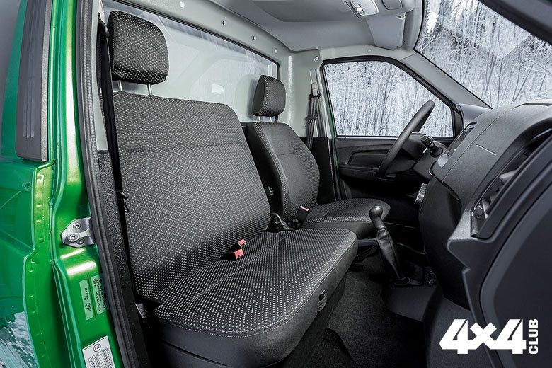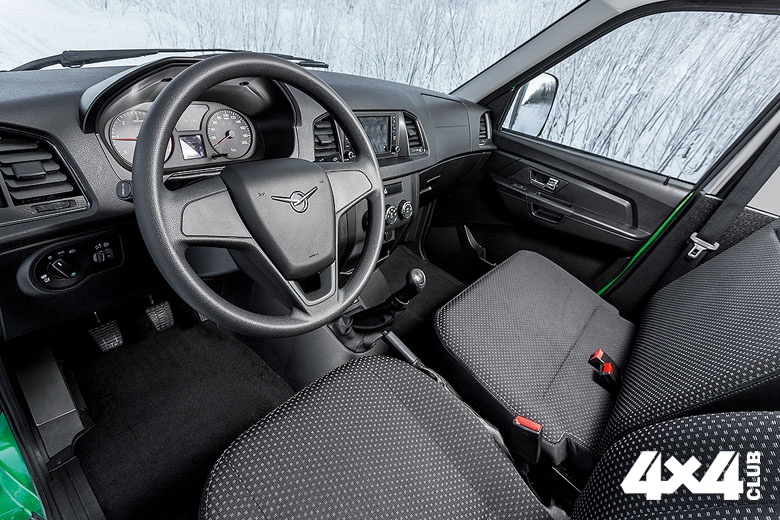 Как ни парадоксально, но самое неудобное место УАЗ «Профи» – его тесная кабина. С кабиной для грузовика ульяновцы поступили просто – ровно так же, как и в «Карго», отрезали кузов за передними дверями и приварили заднюю стенку. Двоим в кабине ещё нормально, сиденья и руль регулируются в двух плоскостях, но вот места под поклажу, типа дорожной сумки, нет совсем. Есть, правда, некоторые свободные полости позади сидений, и под пассажирским – довольно вместительный инструментный отсек, но он занят стандартным набором автомобилиста, огнетушителем и обязательной вне города жёлтой накидкой безопасности. Зато есть чисто грузовая фишка — большой карман на потолке между водителем и пассажиром. Туда без проблем помещается, например, папка с накладными и другими документами. На задней стенке кабины есть пара крючков для верхней одежды, а под ними внушительное гнездо для двухлитровой пластиковой бутылки. Ещё пара карманов для бутылок в дверях — вот и все полезные объёмы довольно тесной кабины. «Профи» интересен тем, что меняет количество посадочных мест в зависимости от вида привода. У внедорожной версии кабина двухместная, а вот у моноприводной между водителем и пассажиром с трудом, но помещается ещё один пассажир. Ну, не то чтобы помещается, но может приютиться. Ноги ему, правда, девать некуда, а левый локоть мешает переключать передачи водителю, но ехать можно, хотя и не долго. Одна из причин этого — рычаг управления раздаткой. Он расположен ровно там, где в трёхместной версии оказываются ноги среднего пассажира. Вместе с появляющимся третьим местом меняет дислокацию и панель включения обогрева сидений и блокировки заднего дифференциала. Есть версия и с двухрядной кабиной, в которой с комфортом рассаживаются пятеро, но прибавка мест для пассажиров отрезает большую часть кузова. Его площадь 4,4 м2, и в нём помещается три стандартных паллета. В узком кузове версии с двухместной кабиной можно расположить четыре европаллета, а в широком — пять.