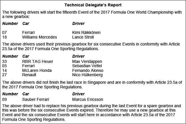У Кими Райкконена и Лэнса Стролла коробка проехала положенную по регламенту дистанцию шести Гран При. Макс Ферстаппен, Себастьян Феттель, Фернандо Алонсо и Нико Хюлкенберг не финишировали в прошлой гонке и получили право поменять коробку без штрафных санкций.