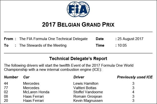 Утром в пятницу в FIA подтвердили замену узлов силовой установки на восьми машинах. Стоффель Вандорн получил новую силовую установку Honda и будет наказан потерей 35 мест на старте.