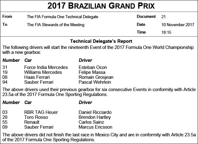 Вечером в пятницу в FIA подтвердили замену коробок передач на восьми машинах – Эстебана Окона, Фелипе Массы, Романа Грожана. Паскаля Верляйна, Даниэля Риккардо, Брендона Хартли, Карлоса Сайнса и Маркуса Эриксона.