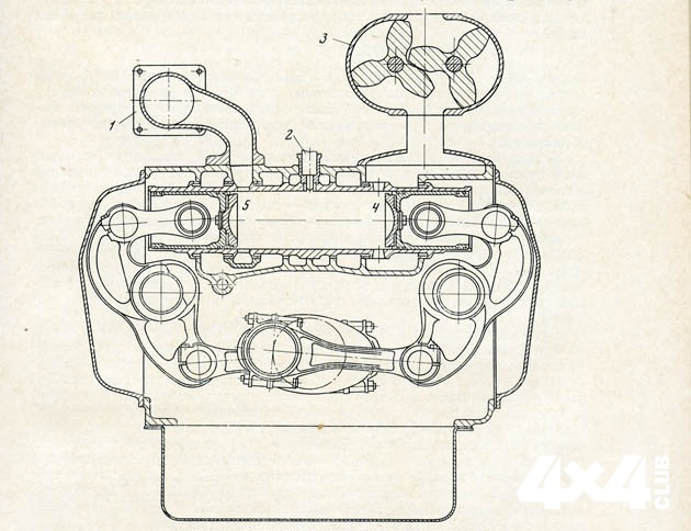 4. впускные окна цилиндров, 5. выпускные окна
