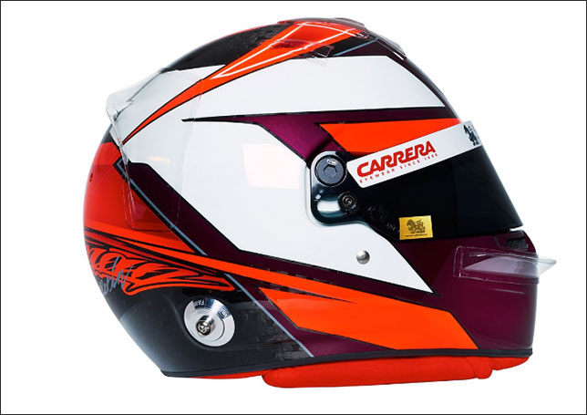 Новое оформление шлема Кими Райкконена несколько отличается от прошлогоднего, хотя общая графическая схема унаследовала ряд особенностей, отражающих предпочтения финна, в том числе надпись Iceman, выполненную знакомым шрифтом.