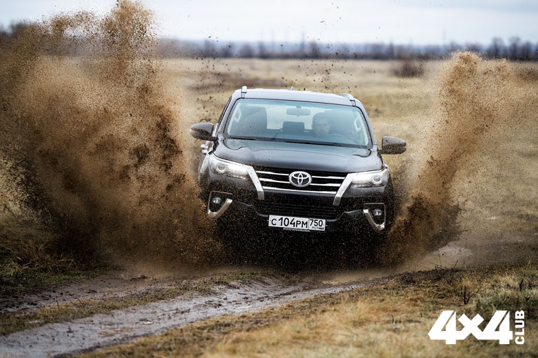Что ж, давайте вместе попробуем оценить новинку с практической стороны. И начнём мы с того, как Fortuner едет. А едет он, надо признать, отлично, даже по осенней степи башкирских предгорий Урала — мерзкой смеси глины, снега, камней и полузамёрзших луж. Двигаться по ним, с одной стороны, несложно — всё более-менее плоско, видно далеко, можно мчать как по дорогам, так и без них. С другой стороны, степи опасны промоинами и глубокими лужами с толстым, но не прочным слоем льда. Кое-где пустынную поверхность облагораживают торчащие кусты, прозрачные зимой, а каждый перелесок скрывает неизменный овражек со всё той же лужей или полуметровой глубины речкой (официально глубина преодолеваемого брода Toyota Fortuner — 700 мм). За два дня такого микста мы проехали более 600 километров, не сбавляя хода, не останавливаясь перед препятствиями и ни разу не достав подвеской до ограничителя. Число взятых вброд речушек перестало фиксироваться на втором десятке, а особым призом стал затяжной скользкий подъём, на котором пришлось снижать давление в шинах и взбираться на него ходом с приличного разгона.