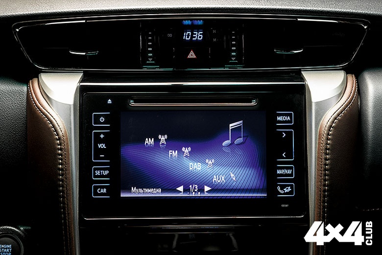 Электронное оборудование Toyota Fortuner по современным меркам выглядит скромно. Начинается оно с семидюймового дисплея на центральной консоли, в котором нет ни навигатора, ни Apple Car Play, ни Android Auto. Единственный разъём USB тут же, внизу. Есть камера заднего вида, задние парктроники, система помощи при спуске с уклона и штатная система стабилизации. Поскольку дизельный двигатель в морозы не слишком жарок, есть электрический догреватель охлаждающей жидкости, обогрев зоны передних дворников, руля и дополнительный обогреватель салона. На дорогой версии установлен электропривод задней двери. Стандартным оборудованием для любого исполнения являются светодиодные фары