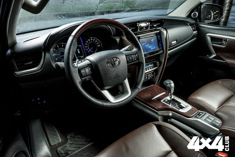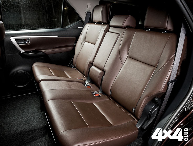Fortuner — редкий сегодня пример крупного внедорожника, чей имидж не испорчен экспериментальным дизайном или соображениями аэродинамики. Семиместный салон, несмотря на неминуемое утяжеление задней части, вписан в обводы машины вполне гармонично (может быть, всё дело в изгибе подоконной линии задних окон, которым вторят непривычные контуры задних арок). В целом внедорожник не перешёл грань чрезмерной гламурности, оставив некоторую долю примитива в грубо очерченной губе бампера. Да и корма избежала стилистического экстремизма — всё размеренно и аккуратно. Внутри ещё интереснее. Интерьер только слегка похож на Hilux. Большая часть деталей своя, причём заметно более качественная. В целом архитектура получилась лаконичной и по впечатлению недешёвой: приятная на ощупь кожа, много прямых линий, минимум матового пластика… Пожалуй, среди подобных внедорожников это самый сбалансированный интерьер. Места на переднем сиденье с запасом даже для рослого водителя. И как я не пытался избегать сравнений, тут без них, видимо, не обойтись. Понятно, что самый очевидный конкурент Fortuner — Mitsubishi Pajero Sport. Опустив субъективизм в сравнениях внешности, отмечу, что Toyota заметно просторнее и в плечах, и в области ног. Средний ряд я бы назвал стандартным для машин подобного класса: три полноценных места, подушка, поднятая выше передних, регулировка угла наклона спинок. Сами сиденья можно сложить в неравной пропорции, открывая проход на третий ряд. Кстати, третий ряд обязателен для обеих комплектаций машины. Сиденья по-тойотовски складываются к бортам и крепятся там захватами. В сложенном состоянии на крупных кочках они дают о себе знать постукиванием. Несомненно, часть владельцев их сразу снимет, благо сделать это совсем просто. Под полом багажника — полноразмерная запаска, крепит которую традиционный подъёмный механизм с отдельной рукояткой, похожей на тоненький «кривой стартер». Ей же приводится в действие и домкрат — всё стандартно. А ещё внутри Toyota Fortuner тихо. Если не брать в расчёт грохот незакреплённой поклажи да постукивание сидений третьего ряда, в салон прорывается только звук мотора, да и то лишь при динамичных обгонах.