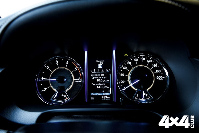 Двигатель пока только один — 2.8-литровый четырёхцилиндровый турбодизель серии GD с крутящим моментом 450 Нм и мощностью 177 л.с. В начале 2018 года должна появиться бензиновая версия со 163-сильным мотором 2.7. Коробка — 6-ступенчатый автомат. Разумеется, есть пониженная передача в раздатке (передаточное отношение — 2,566) и абсолютно честный парт-тайм с электрическим управлением. Всё просто, а простота — залог надёжности, ну и выносливости, раз уж мы говорим о практичности. Тяги мотора хватает в любых условиях бездорожья. Иногда, как в случае скользкого подъёма, препятствия лучше проходить на прямой передаче в раздатке, используя инерцию динамичного автомобиля. Подключать передний мост можно до скорости в 100 км/ч и если в этот момент не пускать внедорожник веером и хоть немного отпустить газ, никакого удара или пинка не последует. Вообще-то, инструкция требует не использовать полный привод на твёрдом покрытии, но здравый смысл и личный опыт говорят нам, что припорошенный снежком асфальт он тоже вполне перенесёт, не говоря уже о грейдерах или полях. Тем более что щёлкнуть переключателем привода — дело секунды, и ещё столько же уйдёт на сам металлический процесс соединения/разъединения муфты. Поведение машины в момент подключения меняется минимально, что тоже очевидный плюс.