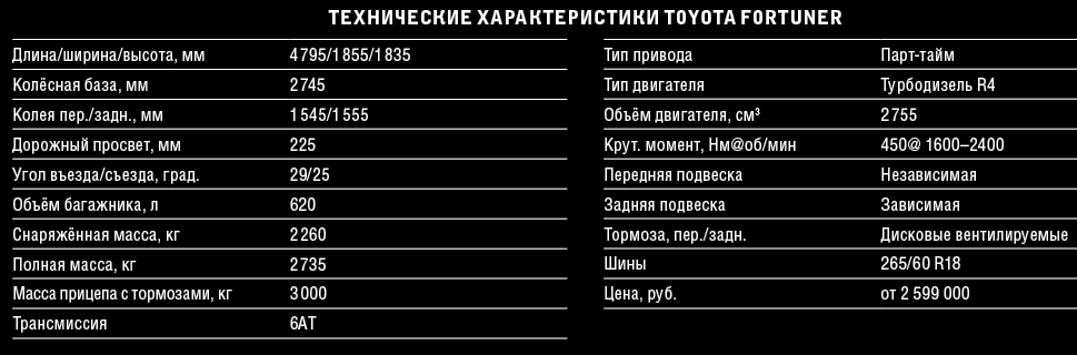 Подводя итог, разделим его на субъективную и объективную части. Субъективно – я давно не садился за руль настолько сбалансированного внедорожника, в котором всего ровно столько, сколько нужно для интенсивного использования. Прежде всего речь идёт о комфорте на бездорожье, проходимости и простоте управления. Объективно — Fortuner, пожалуй, наиболее крепкий из представленных на рынке внедорожников, менее тяжёлый и лучше приспособленный к бездорожью, чем LC 200 и LC Prado, оборудованный чуть скромнее, чем его главный конкурент Mitsubishi Pajero Sport, но немного превосходящий его по цене. К примеру, более доступная версия Fortuner — «Элеганс», в которой уже есть всё, что может понадобиться для лесного или степного драйва, обойдётся в 2 599 000 рублей. Если приплюсовать сюда допоборудование в виде задней электродвери, помощника на спуске, бесключевого пуска и прочих малополезных на офф-роуде деталей, получим топовое исполнение «Престиж» с ценой уже в 2 827 000 рублей. Хотя, на мой взгляд, исчерпывающе хороша именно начальная версия. Есть ли на нашем рынке ниша для подобного автомобиля? Уверен, что есть. Невзирая на отсутствие постоянного полного привода, как у того же Pajero Sport, и родственную близость с TLC Prado, цены на который стартуют там, где заканчивается максимальная комплектация Fortuner. Его козыри — простота конструкции и удачный дизайн, лёгкое управление и простор в салоне. Когда к нынешнему дизелю добавится бензиновый мотор, позиции Fortuner только подрастут. К тому же серьёзные тюнинговые центры уже давно готовы к превращению машины в бескомпромиссного проходимца, благо знакомая рама и агрегаты позволяют это сделать.